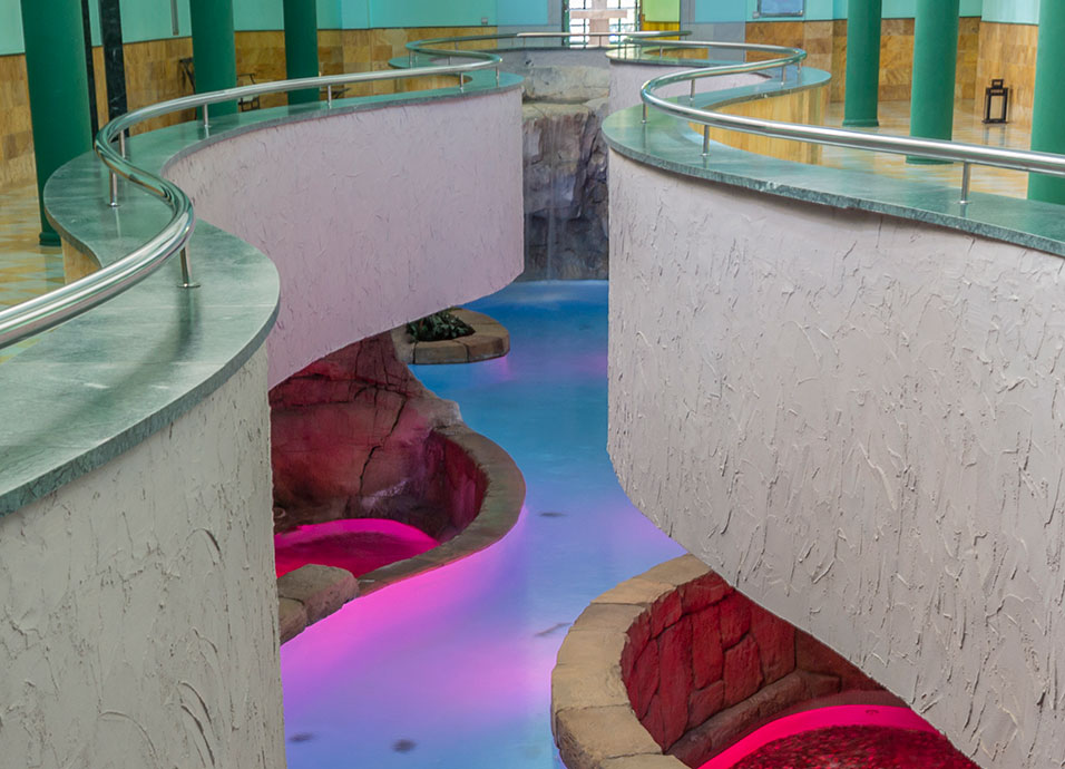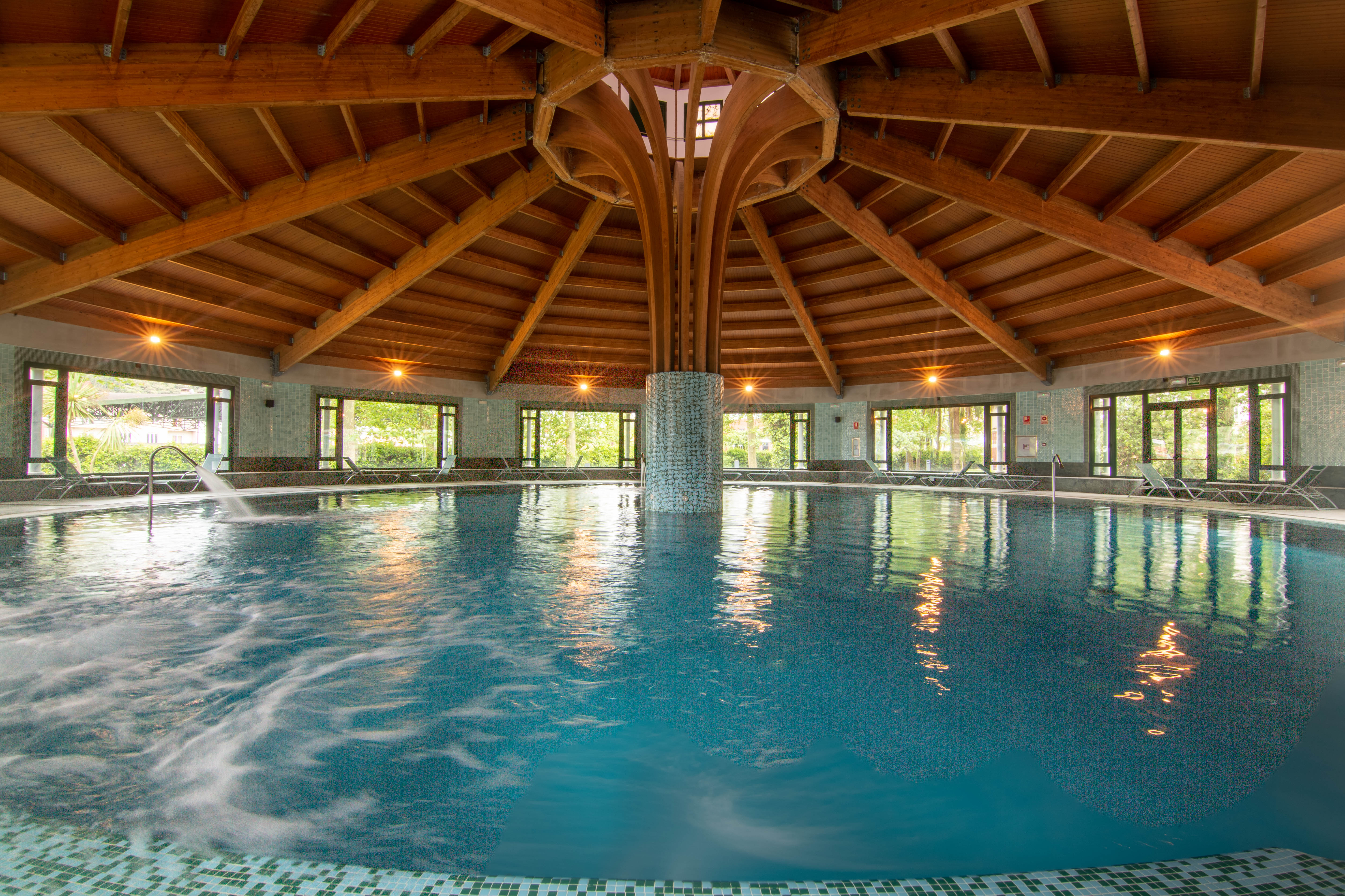Piscina Termal: zona de efervescencia plantar, pasillo dinámico, camas de agua, zona tratamiento dorsal, lumbar y cuellos de cisne. Circuito de contrastes Balnea Romana: vaporarium, piscina fría-caliente, fuente hielo y saunas.