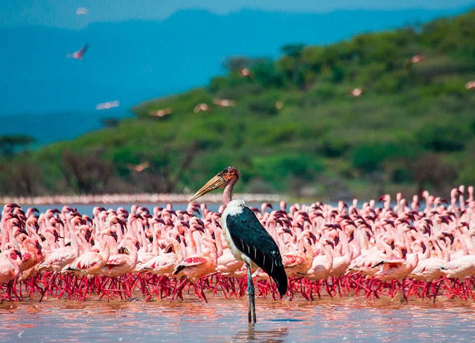 Desayuno. Salida hacia el P.N. del Lago Nakuru. Almuerzo en el lodge. Por la tarde, safari fotográfico bordeando el lago, uno de los paraísos ornitológicos del mundo. Rodeado por bosques de acacias de tronco amarillo y euforbias, alberga más de 450 especies de aves y diversas familias de mamíferos. Pero lo más conocido de este pequeño lago son los flamencos rosados que en ciertas temporadas superan el millón de ejemplares. Es también el parque del este de África con mayor concentración de rinocerontes y quizás en el único lugar que todavía se puede ver el rinoceronte blanco. Cena y alojamiento