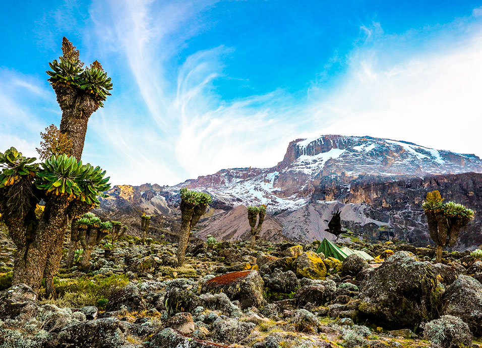 Desayuno. En el caso del alojamiento en Lago Manyara salida hacia Arusha y en el caso de alojamiento en Tarangire, salida hacia Arusha haciendo safari por el parque en ruta. Ambas opciones: desde Arusha, salida hacia Namanga situada en la frontera de Kenya / Tanzania. Trámites de frontera, cambio de vehículos y continuación hasta el parque Nacional de Amboseli. Llegada y almuerzo en el lodge. Safari por la tarde por el parque situado a los pies del Monte Kilimanjaro y su majestuosa cumbre de nieves perpetuas y, aunque pertenece a Tanzania, ofrece su mejor vista desde Amboseli en días claros. Debido a la buena filtración de la roca volcánica, este árido paisaje posee varias zonas pantanosas cuyas aguas atraen una extensa población estable de vida salvaje, más de 50 especies de mamíferos, siendo las grandes manadas de elefantes el mayor atractivo de la zona. Las jirafas, ñus, cebras, gacelas, jabalíes, etc. abundan por sus llanuras. Cena y alojamiento en lodge.