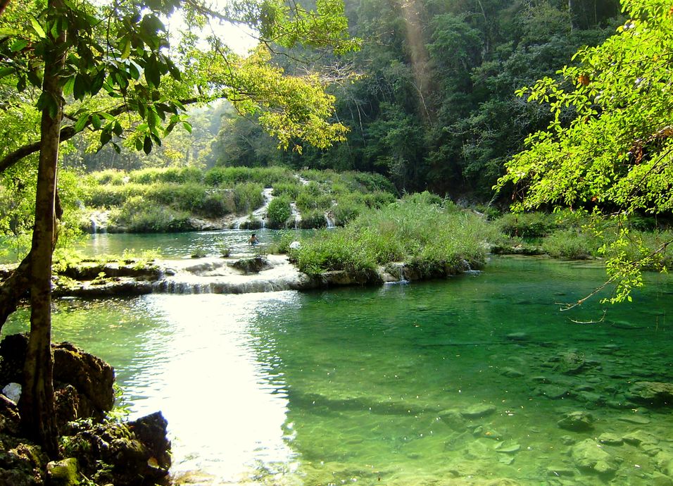 Desayuno. Por la mañana visita de Semuc Champey, que está localizado en el municipio de Lankin, sobre el río Cahabón. Semuc Champey está construido por un puente natural de piedra, en cuyo interior, el río Cahabón circula subterráneamente, en lo que se conoce como un “siguán”. En la parte superior se forma una gran variedad de pozas de 1 a 3 metros de profundidad, que son alimentadas por manantiales de la montaña. Estas pozas se localizan en un pequeño cañón formado por roca sedimentaria y caliza propia de las tierras altas del valle del Polochic. Finalizada la visita regreso al hotel y alojamiento.