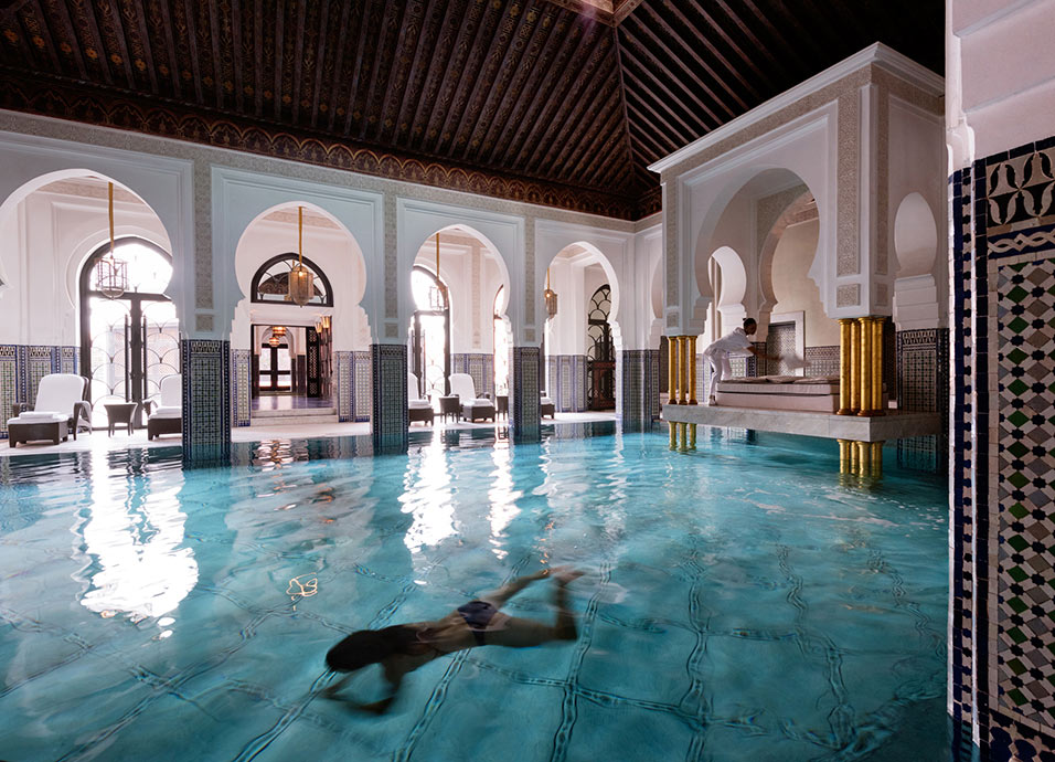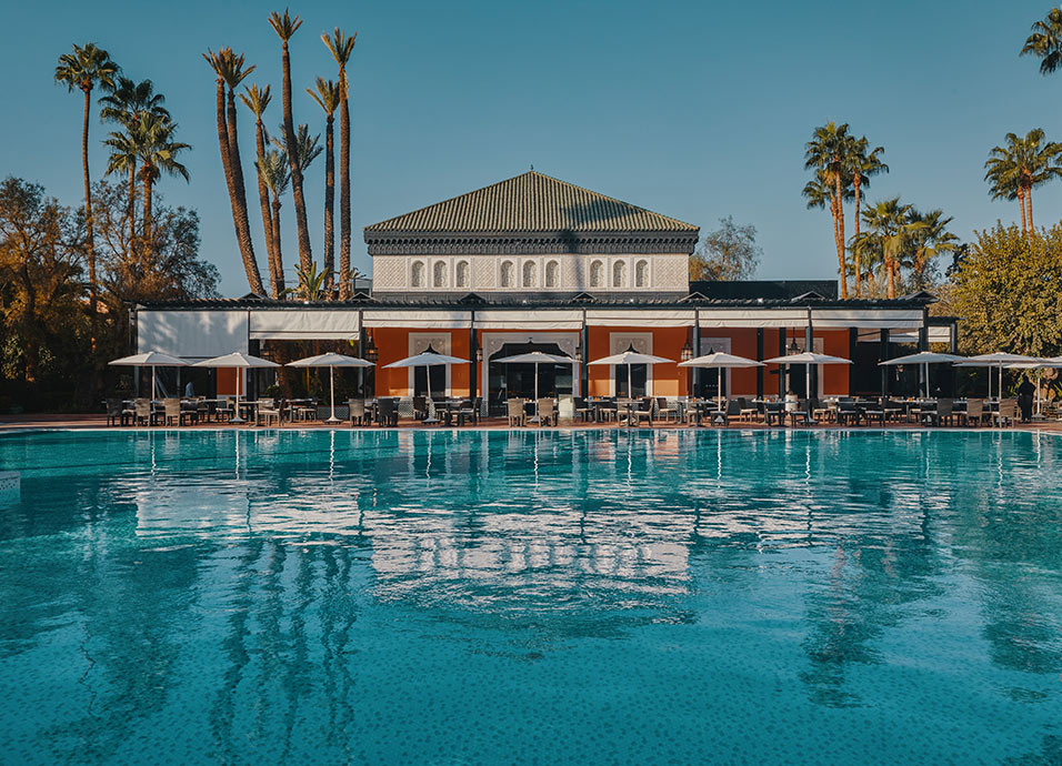 Palacio- hotel de 1923, ligado a la historia de Marrakech, sus colores y sus tradiciones. Único por sus ambientes y estilos marroquíes que combinan con las últimas tecnologías. Situado sobre 8 hectáreas de magníficos jardines limitados por las murallas del s. XII. Considerado el hotel más refinado de Marruecos.