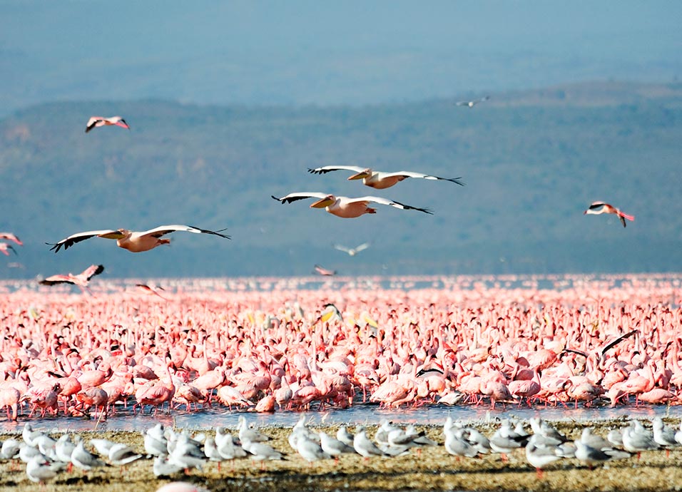 Desayuno. Salida hacia el P.N. del Lago Nakuru. Almuerzo en el lodge. Por la tarde, safari fotográfico bordeando el lago, uno de los paraísos ornitológicos del mundo. Rodeado por bosques de acacias de tronco amarillo y euforbias, alberga más de 450 especies de aves y diversas familias de mamíferos. Pero lo más conocido de este pequeño lago son los flamencos rosados que en ciertas temporadas superan el millón de ejemplares. Es también el parque del este de África con mayor concentración de rinocerontes, y quizás en el único lugar que todavía se puede ver el rinoceronte blanco. Cena y alojamiento.