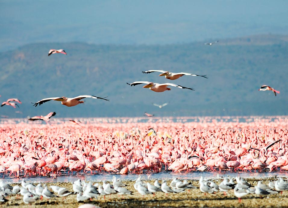 Desayuno. Salida hacia el P.N. del Lago Nakuru. Almuerzo en el lodge. Por la tarde, safari fotográfico bordeando el lago, uno de los paraísos ornitológicos del mundo. Rodeado por bosques de acacias de tronco amarillo y euforbias, alberga más de 450 especies de aves y diversas familias de mamíferos. Pero lo más conocido de este pequeño lago son los flamencos rosados que en ciertas temporadas superan el millón de ejemplares. Es también el parque del este de África con mayor concentración de rinocerontes, y quizás en el único lugar que todavía se puede ver el rinoceronte blanco. Cena y alojamiento.