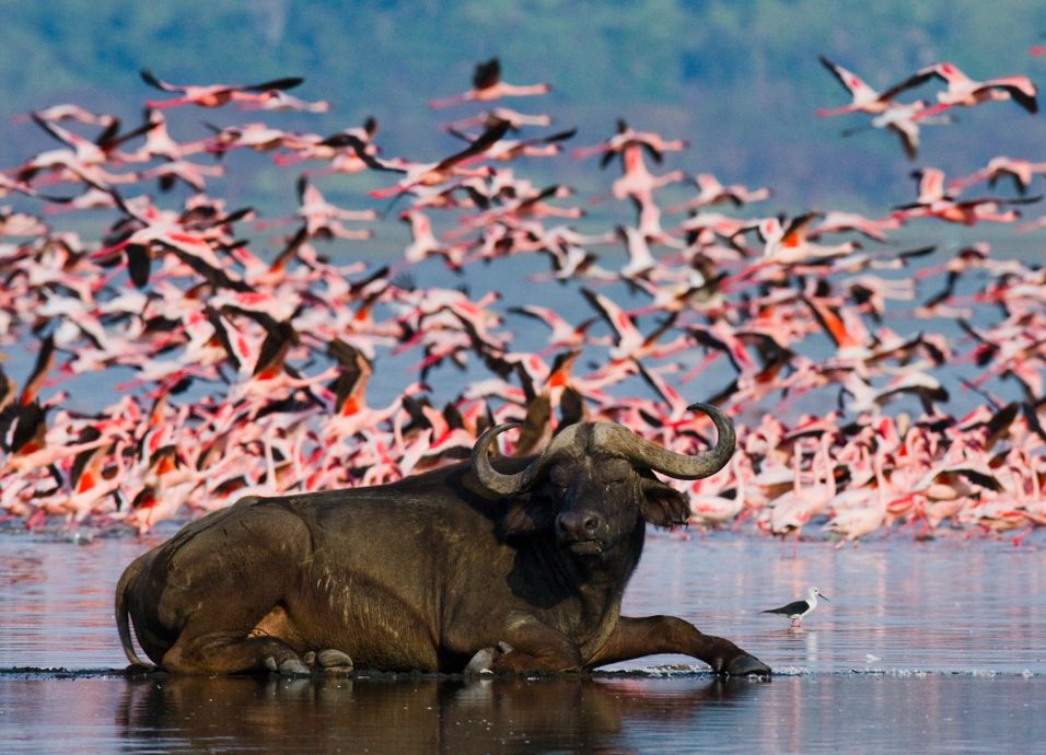Desayuno. Salida hacia el P.N. del Lago Nakuru. Llegada y almuerzo en el lodge. Por la tarde, safari fotográfico bordeando el lago, uno de los paraísos ornitológicos del mundo. Rodeado por bosques de acacias de tronco amarillo alberga más de 450 especies de aves y diversas familias de mamíferos. Pero lo más conocido de este pequeño lago son los flamencos rosados que en ciertas temporadas superan el millón de ejemplares. Es también el parque del este de África con mayor concentración de rinocerontes. Regreso al lodge. Cena y alojamiento.