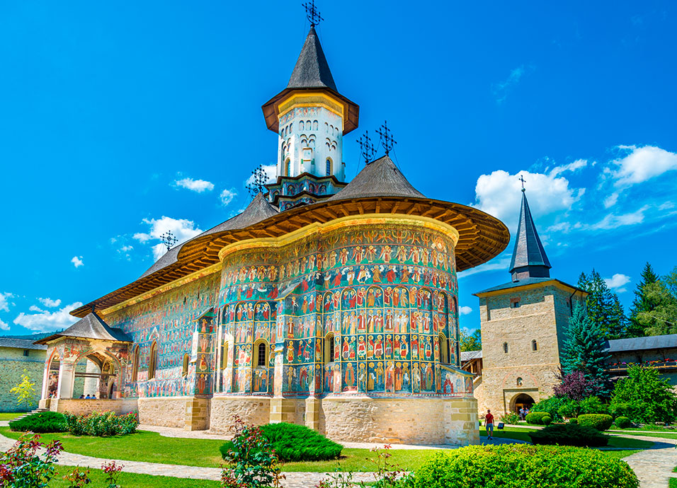 Desayuno. Visita de Sighisoara, ciudad medieval mejor conservada de Rumanía. Podrás admirar su casco antiguo, incluyendo la Torre del Reloj, el más conocido monumento de la ciudad. Salida hacia Targu Mures con visita panorámica por sus plazas y edificios, entre los que destacan la prefectura y el Palacio de la Cultura. Almuerzo. Continuación hacia Bucovina, conocida por sus monasterios de los s. XV y XVI, declarados Patrimonio de la Humanidad, que conforman uno de los legados de arte bizantino más importantes del mundo. Visita del monasterio Voronet del 1488, nombrado la Capilla Sixtina del Este de Europa y considerado la joya de Bucovina por el famoso ciclo de frescos externos que decoran la iglesia, siendo el más famoso “El Juicio Universal. Alojamiento.