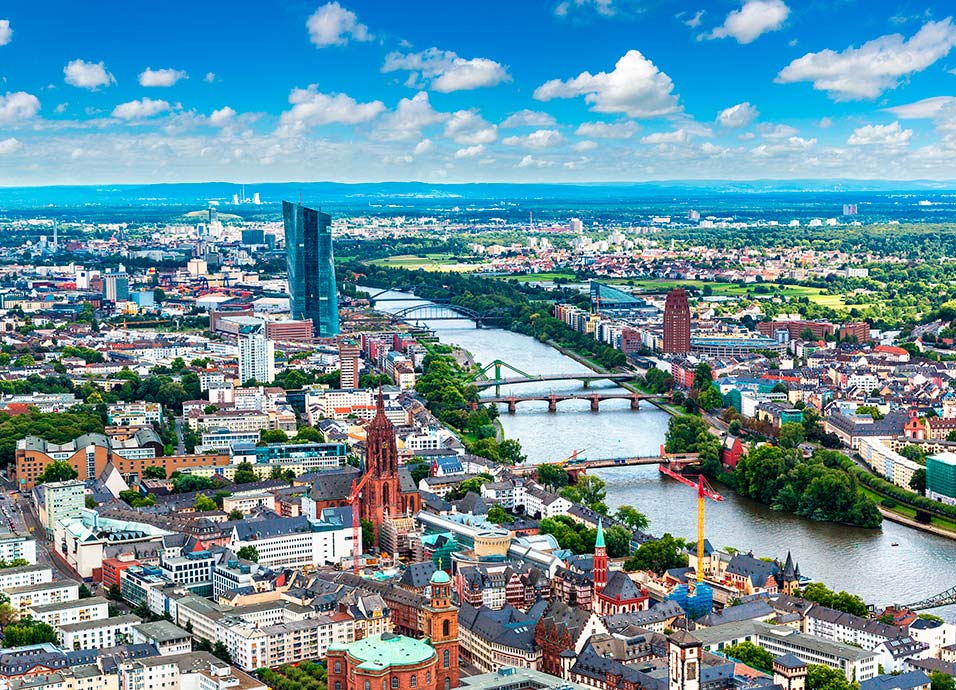 Salida en avión con destino a Frankfurt. Llegada al aeropuerto y recogida del coche de alquiler. Frankfurt, la capital financiera del país, está marcada por sus contrastes en lo moderno y lo histórico; entre sus monumentos destacan el “Römer” (hoy el Ayuntamiento), con edificios del s. XV y XVI, la fuente de la Justicia, la catedral (en la que eran coronados los emperadores del Sacro Imperio Romano), la iglesia de San Pablo, etc. Alojamiento