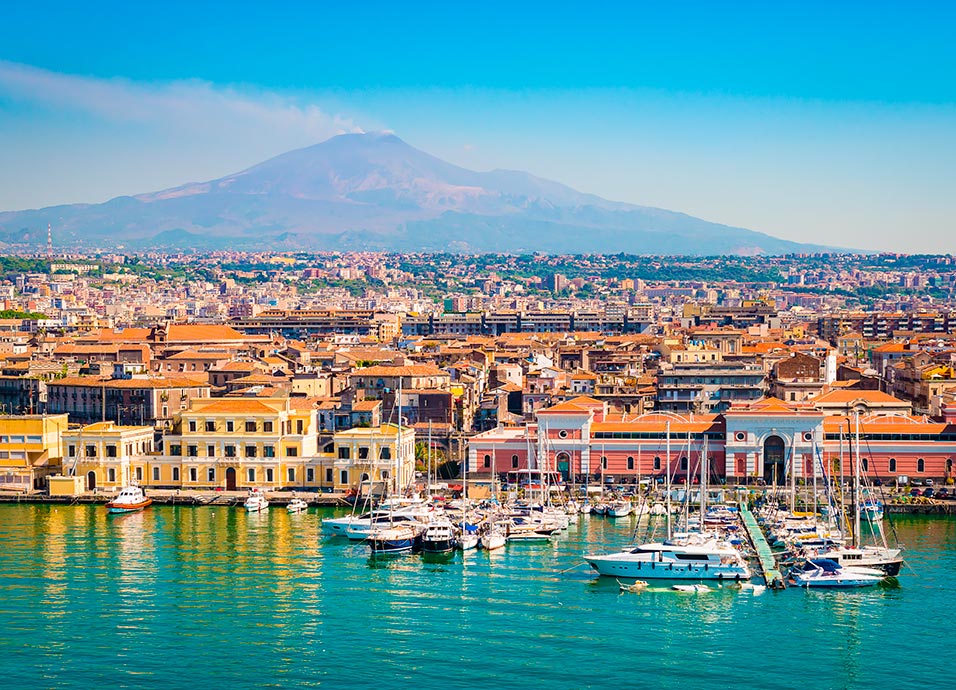 Desayuno. Salida (si las condiciones meteorológicas lo permiten)hacia el monte Etna: el volcán más alto, y activo, de Europa (3.345 metros): el autobús llegará hasta los 1.800 ms de altitud. Visita de los cráteres apagados. Almuerzo en una casa rural a los pies del Etna donde disfrutarás de una comida típica podrás degustar el vino del Etna de producción propia. Continuación a Taormina. Tiempo libre para compras, para descubrir las románticas callejuelas de la ciudad o para visitar el famoso Teatro Griego desde donde se puede gozar de un magnífico panorama del Etna y del Mar Jonio. Regreso a Catania para realizar una visita panorámica a pie. Alojamiento.
